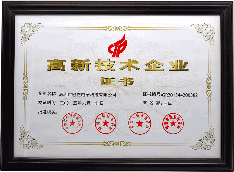 2015年深圳市敏杰电子科技有限公司被深圳市科技创新委员会评为高新技术企业。